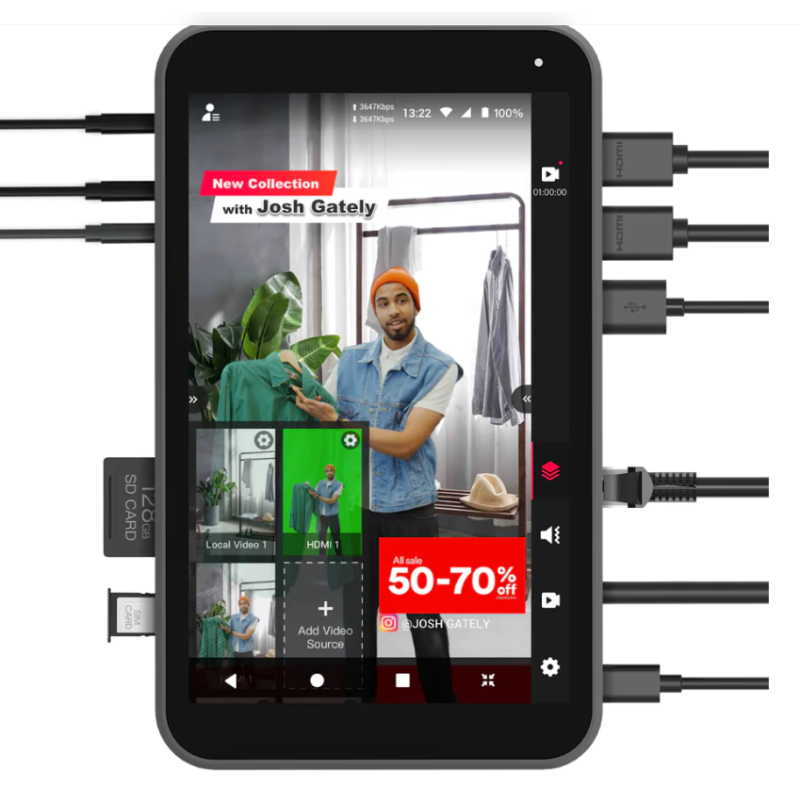 Encoder, switcher, recorder, monitor - 2 HDMI In + 1 USB In + SD Card - Running On Android OS - No computer/OBS required - 3 Ways to Connect Wifi, 4G LTE, Ethernet - Total Touch Screen Control - Internal Battery Lasts for 3+ hours - Compact size, fits into backpack - Live On the Go